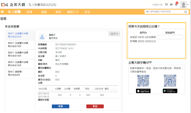 員工可於私人秘書首頁直接查詢公司員工當日的出勤狀況(請假、公出或在勤),系統預設顯示同部門的員工出勤狀況,若要查詢其它部門的同仁,請輸入員工姓名或編號搜尋。但權限是否開啟是由HR在”員工權限管理”進行掌控哦!